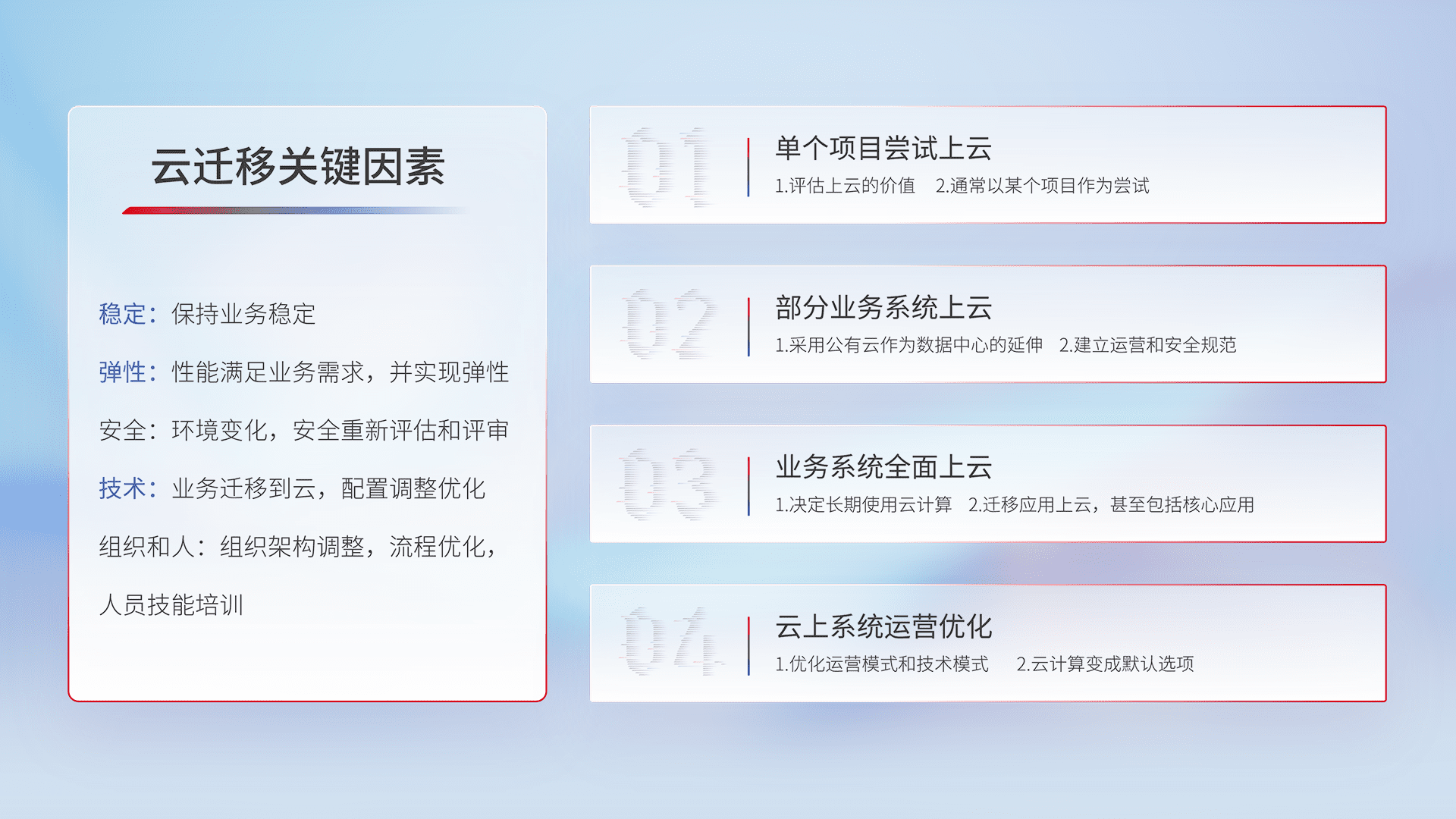 结合实际业务,,,从规划设计、、云平台选型、、云原生改造、、、、数据迁移、、、集成交付,,,迁移全过程为客户识别最佳上云路径,,,做好风险识别管理,,,设计网络架构、、身份权限、、、安全审计合规、、、、操作审计、、日志审计、、、、监控告警策略、、、多站点容灾设计等,,,对云上基础设施进行整体规划,,,提升IT治理水平,,以满足弹性、、、高可用、、、、高性能的需求。。。