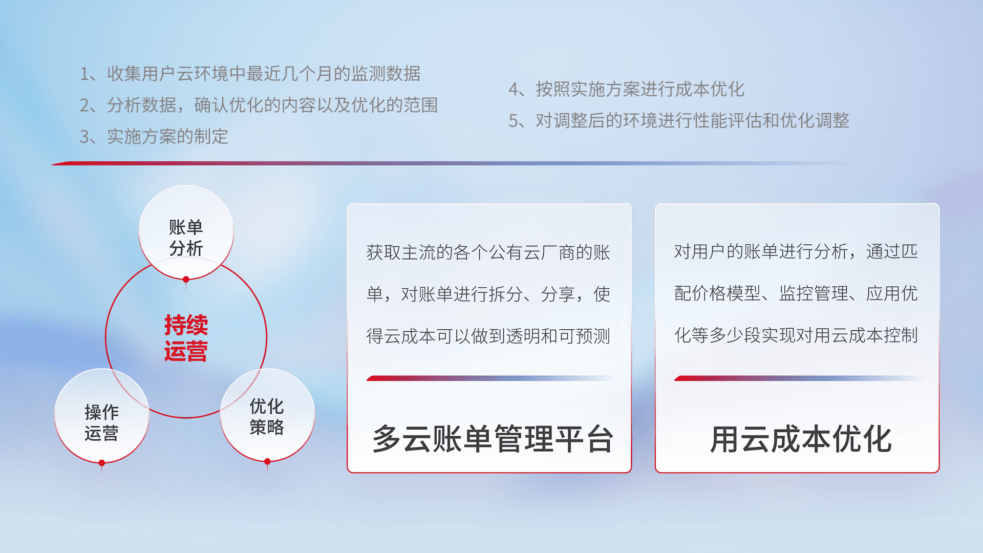 通过多云纳管,,以统一的资源数据模型把客户的云资源进行抽象和封装,,进而实现对多云资源的统一操作,,,保障云资源管理的可靠性、、、、稳定性与可用性。。。。量身定制化运维内容,,,,配置、、、开发运维、、补丁管理、、、备份、、监控、、认证和访问管理、、、审计和日常巡检等,,,保障在用云过程中的可靠度,,,稳定度以及高可用率。。。