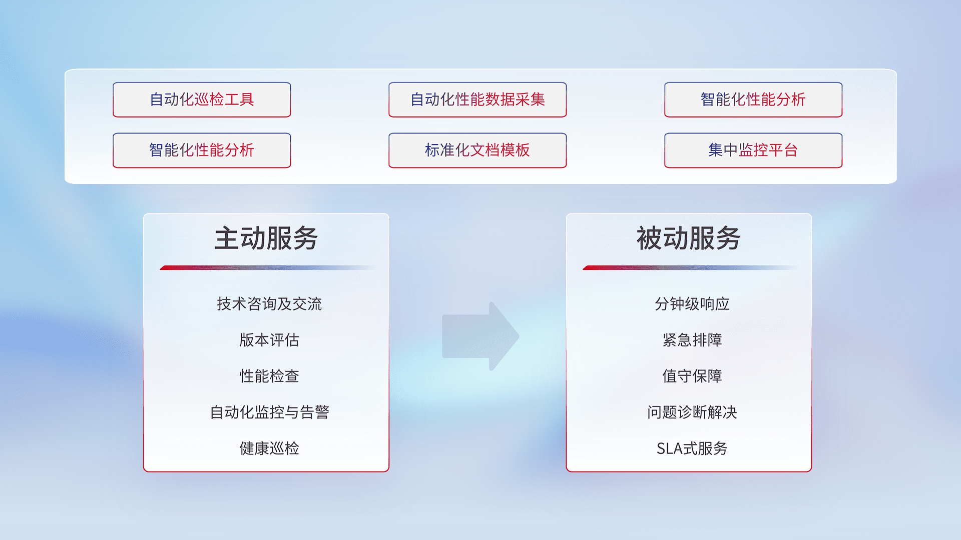 智能化工具和标准化文档,,,,保障服务质量,,,,提供主动服务(包含技术咨询、、版本评估、、、、性能检查、、自动化监控与告警、、、、健康巡检)和被动服务包含(分钟级响应、、、紧急排障、、值守保障、、问题诊断解决、、SLA服务)。。