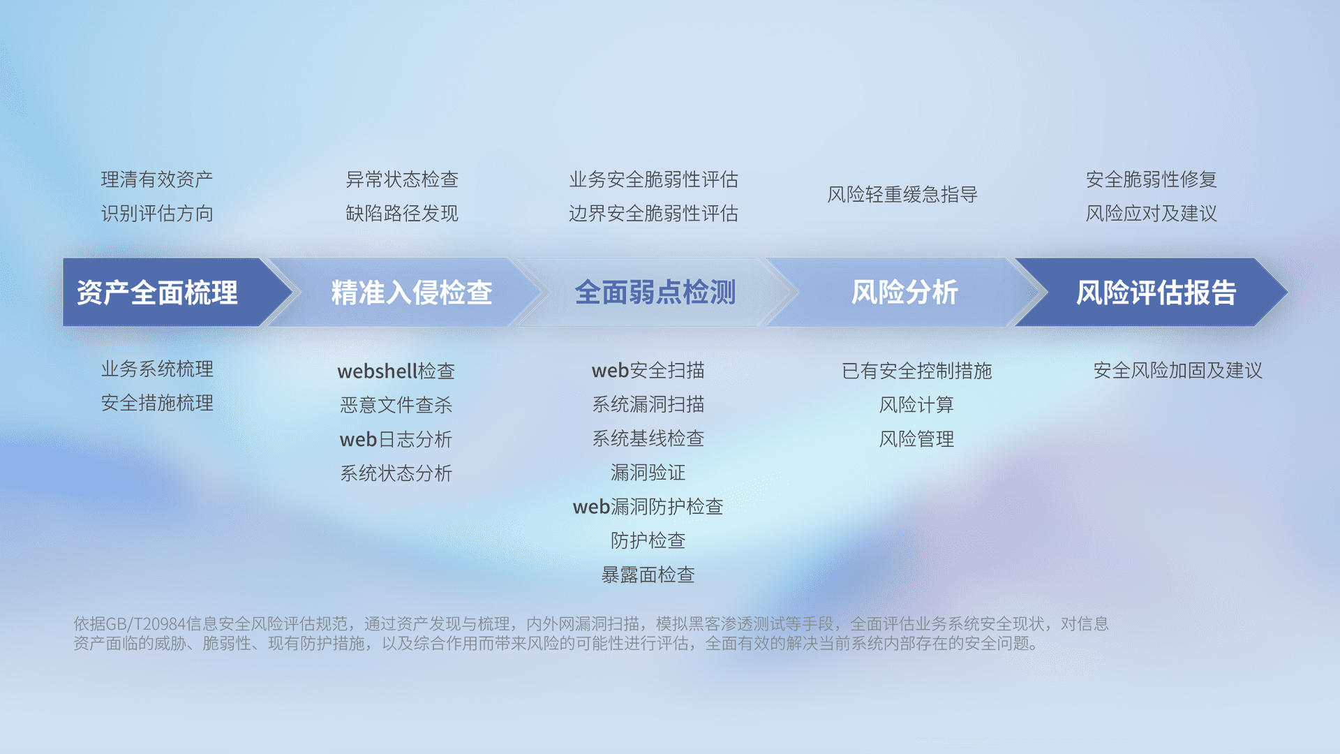 针对客户行业特性,,以专业的安全服务+多厂商联合解决方案提供专属的一站式安全管理服务,,,帮助客户全面感知网络空间威胁,,,,基于识别、、、检测、、、、分析、、、、防护、、监测、、、、响应的服务理论模型,,从方案咨询、、、、集成交付、、、、评估验证、、优化加固、、运维运营,,,,致力于为客户提供完整的闭环管理式安全服务。。。。以实战经验为客户打造高抵御风险的安全体系,,帮助客户发现威胁、、、、对抗威胁、、、、处置威胁,,,,不断积累安全对抗能力,,,持续保障数字化安全。。